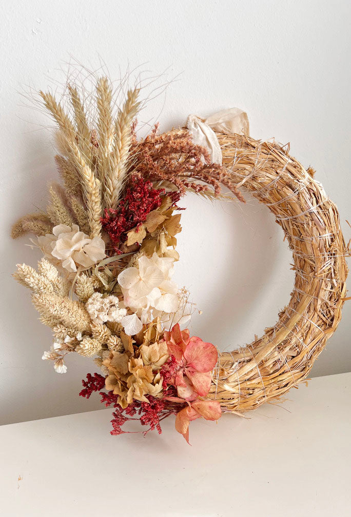 Corona de paja con hortensia y flor seca – Estilo rústico