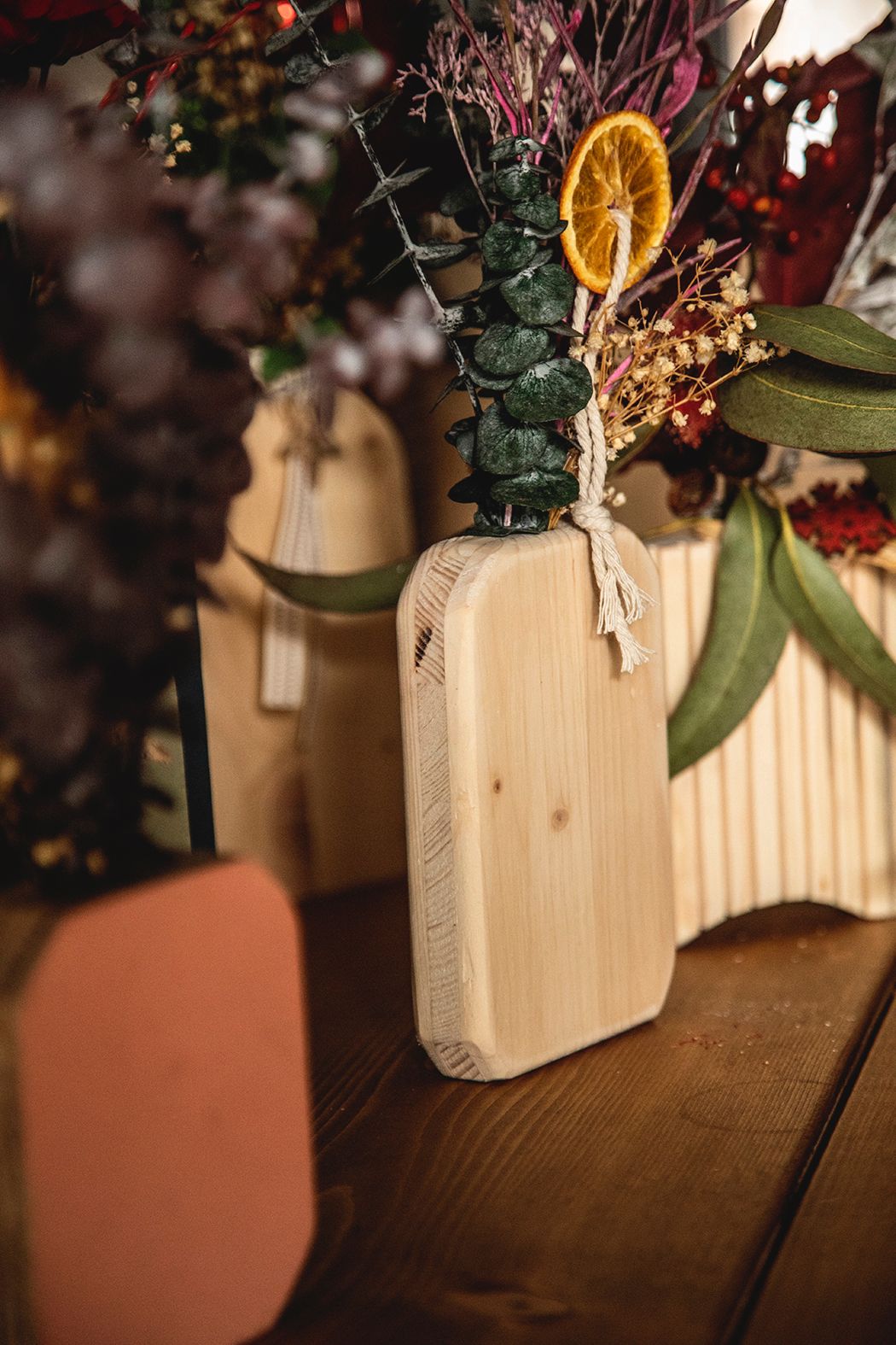 La composición de flor preservada, complementa la madera de forma armoniosa, creando un conjunto que transmite calma y naturalidad sin necesidad de mantenimiento.